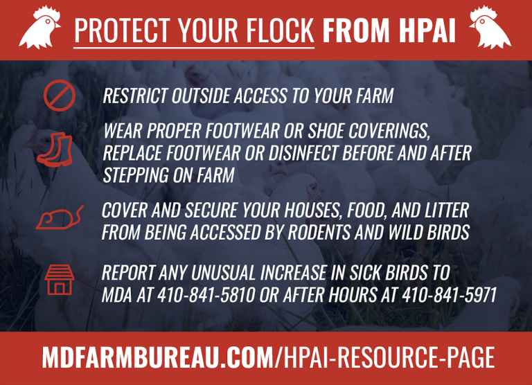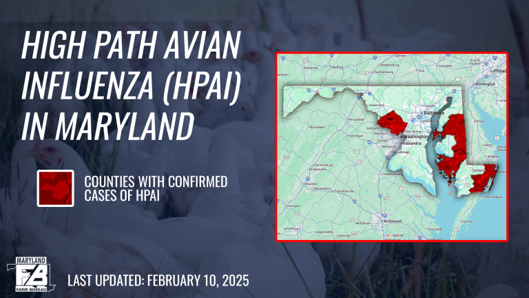 On January 30th, 2025, the first case of HPAI on the Western Shore of Maryland has been identified at a backyard flock in Montgomery County. All Maryland poultry farmers are encouraged to enhance biosecurity measures on their operations.